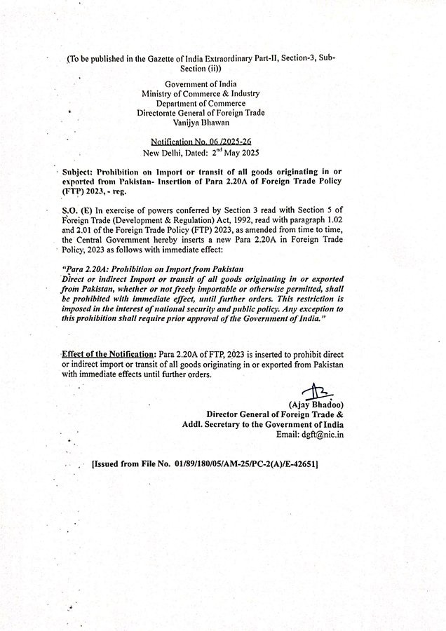 తాజాగా ఆ దేశం నుంచి మన దేశానికి వచ్చే అన్ని రకాల ఉత్పత్తులపై నిషేధం విధించింది. ఈ మేరకు కేంద్ర వాణిజ్య మంత్రిత్వ శాఖ తాజాగా నోటిఫికేషన్ విడుదల చేసింది. పాకిస్థాన్ నుంచి భారత దేశానికి ప్రత్యక్ష దిగుమతులు చాలా తక్కువగా ఉన్నప్పటికీ.. కొన్ని వస్తువులు పరోక్ష మార్గంలో, మూడో దేశాల ద్వారా దేశంలోకి ప్రవేశిస్తున్నాయి.