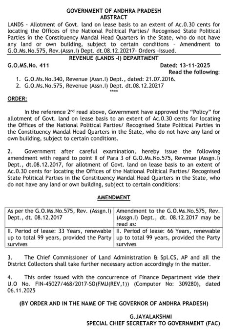ఏపీలో రాజకీయ పార్టీలకు భూమి కేటాయింపు లీజు కాలం పెంచుతూ ఉత్తర్వులు జారీ చేసింది చంద్రబాబు సర్కార్. 33 ఏళ్ల కాలం లీజు 66 ఏళ్లకు పెంచుతూ సవరణ జీవో విడుదల చేసింది.