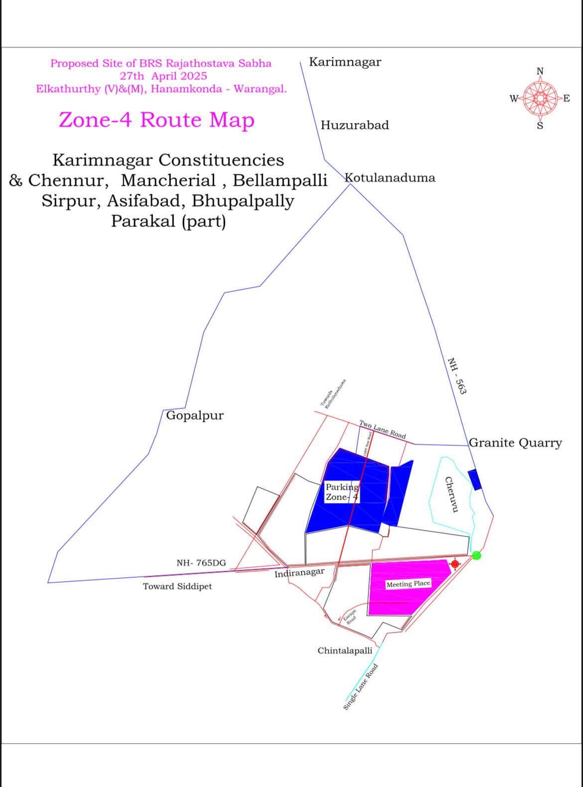 ()జోన్ 4లో కరీంనగర్ జాతీయ రహదారి 563 మీదుగా వచ్చే వాహనాలు హుజురాబాద్, కోతులనడుమ, గ్రానైట్ క్వారీ మీదుగా పార్కింగ్ జోన్ 4 కు వాహనాలు చేరుకునేలా ఏర్పాట్లు