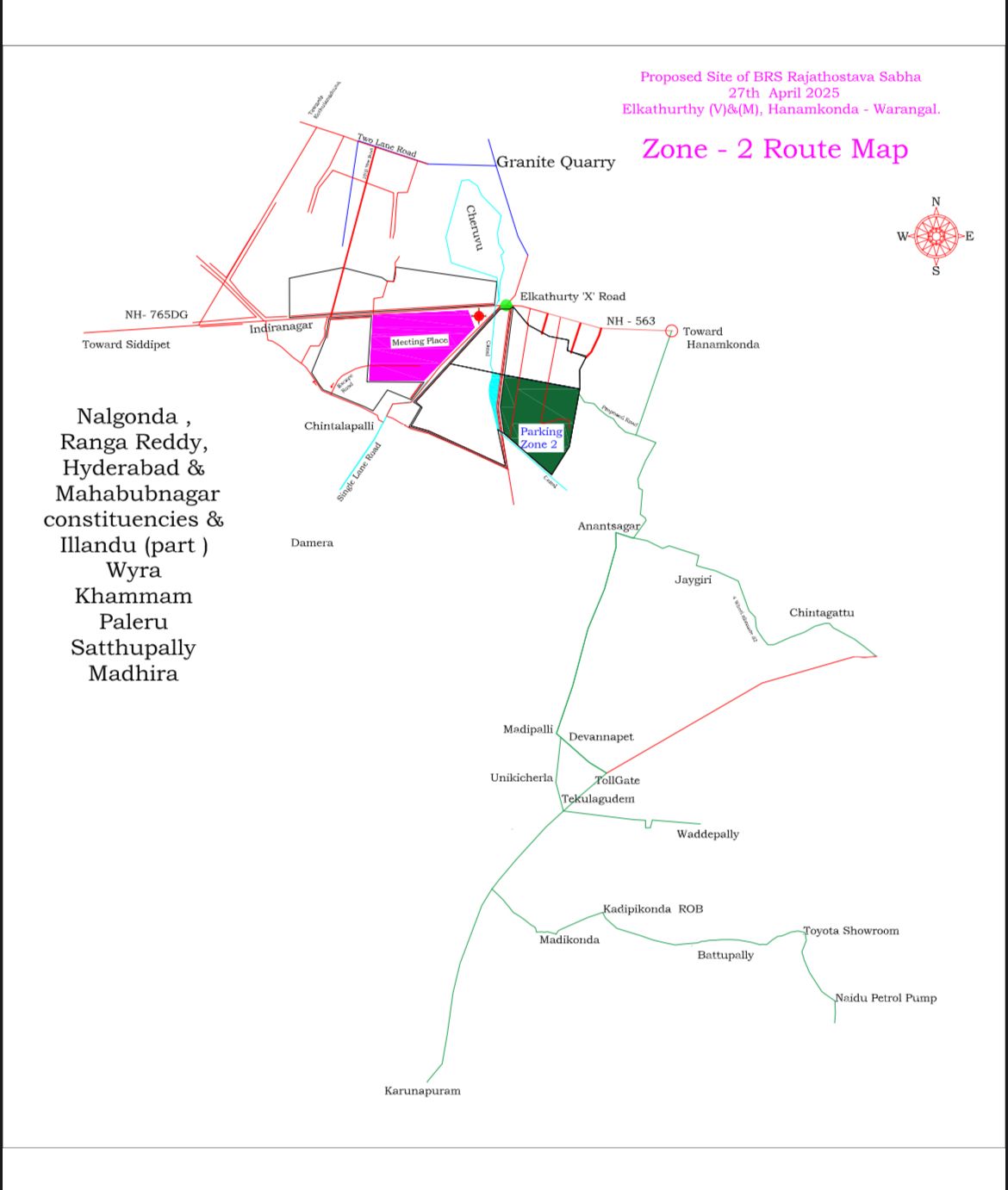 ()ధర్మసాగర్ నుంచి చింతలపల్లి సభ జరిగే ప్రాంగణానికి అనుకుని ఉన్న రోడ్ : ఈ రూట్ నుంచి స్టేషన్ ఘనపూర్, జనగామ నియోజకవర్గాల నుంచి వాహనాలు వచ్చే అవకాశం