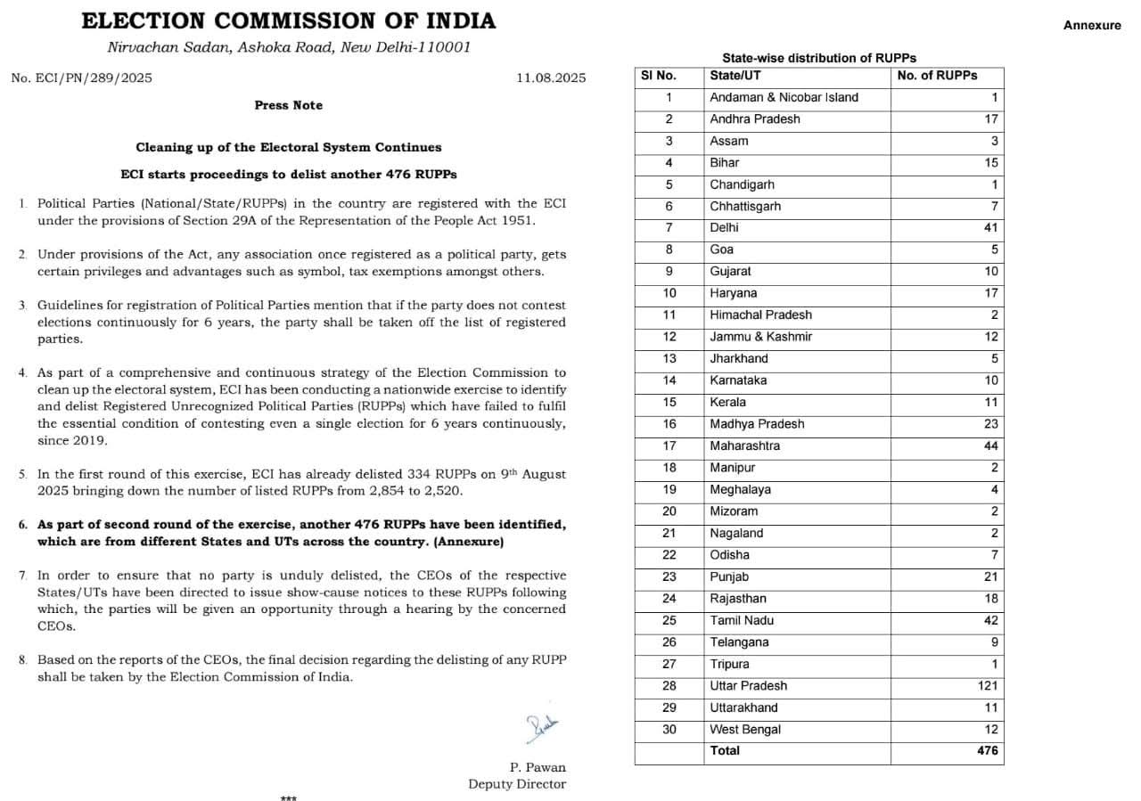 తొలి జాబితాలో 334 పార్టీల గుర్తింపు రద్దు చేసింది ఈసీ. తాజాగా మరో 476 పార్టీల గుర్తింపు రద్దుకు ఈసీ నిర్ణయం తీసుకుంది.