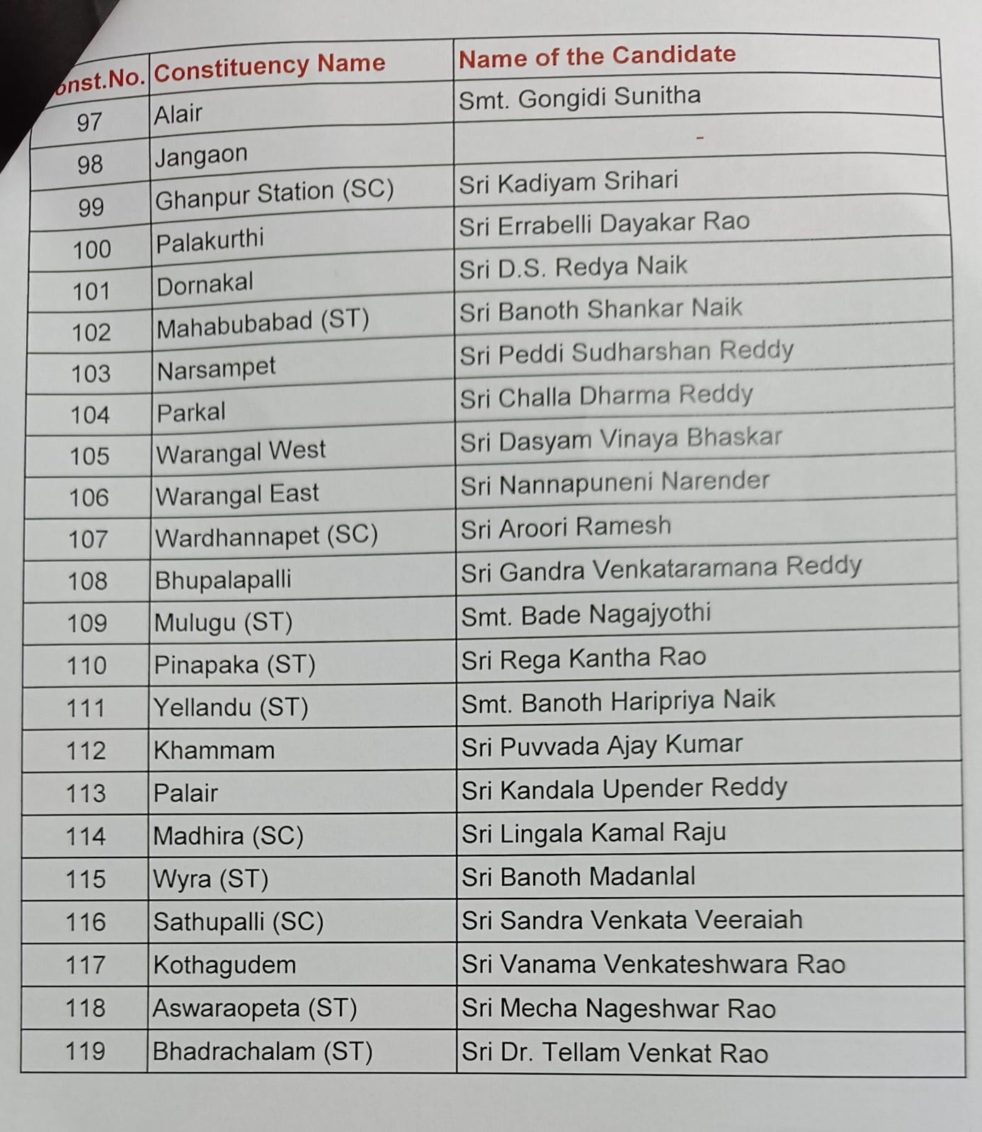 There are no major changes in the list announced KCR the CM and the TRS Boss here at the TRS Bhavan in Hyderabad. He was addressing a press meet today for releasing the list of candidates for the coming elections in December.