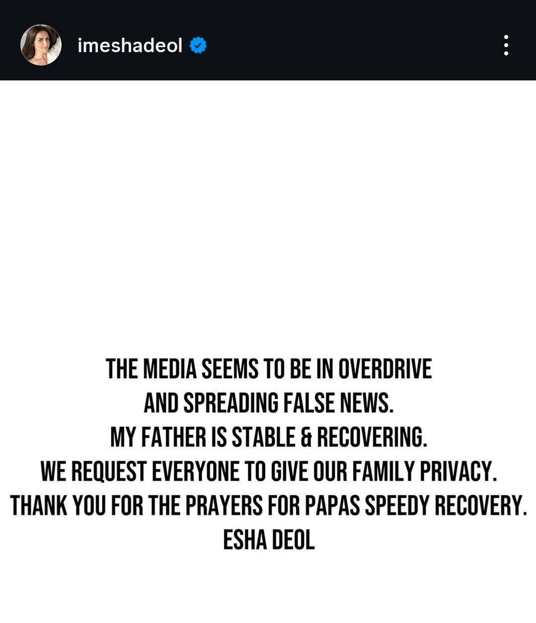 నాన్న ఆరోగ్యంగానే ఉన్నారని, మీడియాలో వస్తున్న వార్తలు నిజం కాదంటూ ఆయన కూతురు ఈషా డియోల్ పోస్ట్ చేశారు. ధర్మేంద్రకు ఇద్దరు భార్యలు ప్రకాశ్ కౌర్, హేమమాలిని అని తెలిసిన సంగతి తెలిసిందే.
