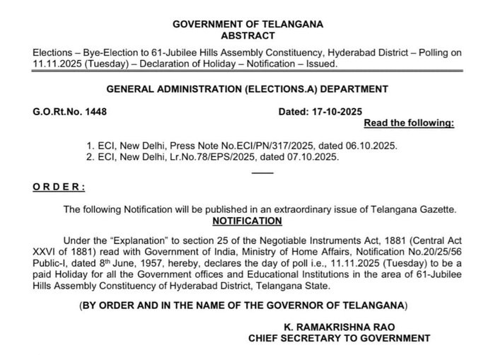 జూబ్లీహిల్స్ అసెంబ్లీ స్థానానికి నవంబర్ 11న ఉప ఎన్నిక పోలింగ్ జరగనుంది. పోలింగ్ రోజున జూబ్లీహిల్స్ అసెంబ్లీ నియోజకవర్గం పరిధిలోని అన్ని ప్రభుత్వ కార్యాలయాలు, విద్యా సంస్థలకు ప్రభుత్వం సెలవు ప్రకటించింది. ఈ మేరకు ప్రభుత్వ ప్రధాన కార్యదర్శి కె.రామకృష్ణారావు శుక్రవారం ఉత్తర్వులు విడుదల చేశారు.