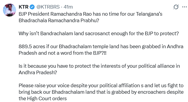 ఏపీలో భద్రాచలం ఆలయ భూముల కబ్జాపై స్పందించారు మాజీ మంత్రి కేటీఆర్. రాముడి భూములు కబ్జా అయినా బీజేపీ తెలంగాణ అధ్యక్షుడు రామచందర్ రావు ఎందుకు మౌనంగా ఉన్నారు? చెప్పాలన్నారు.