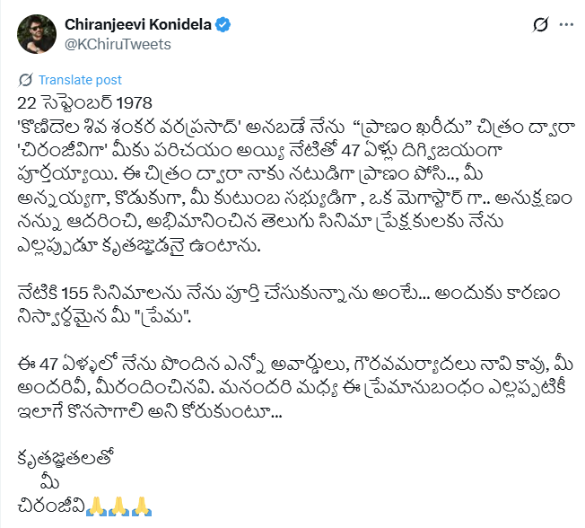 నేటికి 155 సినిమాలను నేను పూర్తి చేసుకున్నాను అంటే… అందుకు కారణం నిస్వార్ధమైన మీ “ప్రేమ”.ఈ 47 ఏళ్ళలో నేను పొందిన ఎన్నో అవార్డులు, గౌరవమర్యాదలు నావి కావు, మీ అందరివీ, మీరందించినవి. మనందరి మధ్య ఈ ప్రేమానుబంధం ఎల్లప్పటికీ ఇలాగే కొనసాగాలి అని కోరుకుంటూన్నానని తెలిపారు చిరు.