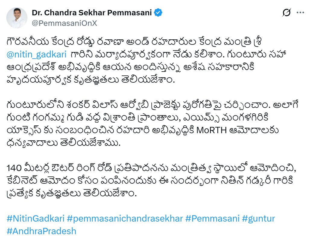 గుంటూరులోని శంకర్ విలాస్ ఆర్వోబీ ప్రాజెక్టు పురోగతిపై గడ్కరీతో చర్చించారు పెమ్మసాని. 140 మీటర్ల ఔటర్ రింగ్ రోడ్డు ప్రతిపాదనను మంత్రిత్వ స్థాయిలో ఆమోదించి, కేబినెట్ ఆమోదం కోసం పంపినందుకు నితిన్ గడ్కరీకి ప్రత్యేక కృతజ్ఞతలు తెలియజేశారు పెమ్మసాని.