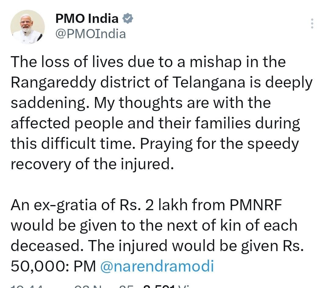 చేవెళ్ల బస్సు ప్రమాద మృతులకు కేంద్రం ఎక్స్గ్రేషియా ప్రకటించింది. చేవెళ్ల బస్సు ప్రమాద ఘటనపై తీవ్ర దిగ్భ్రాంతి వ్యక్తం చేశారు ప్రధానమంత్రి నరేంద్ర మోదీ. మృతుల కుటుంబాలకు రూ.2 లక్షల చొప్పున పరిహారం ప్రకటించారు మోదీ.