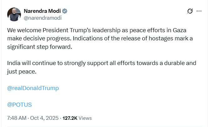 గాజాలో శాంతి సాధనకు అమెరికా అధ్యక్షుడు డోనాల్డ్ ట్రంప్ చేస్తున్న ప్రయత్నాలను స్వాగతించారు ప్రధానమంత్రి నరేంద్ర మోదీ. బందీల విడుదలకు అంగీకరించడం శాంతి స్థాపనకు కీలక ముందడుగు అని ట్వీట్ చేశారు.