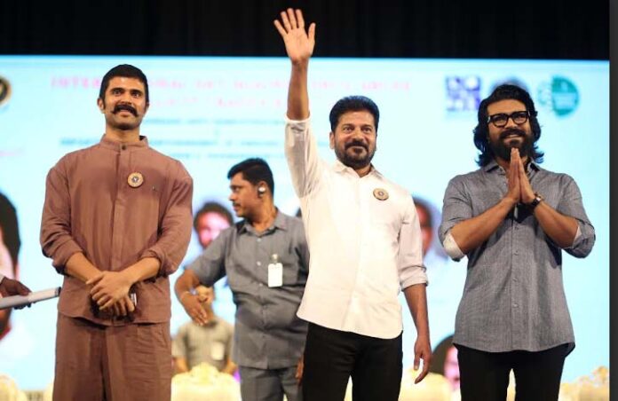 ముఖ్యమంత్రి శ్రీ రేవంత్ రెడ్డి మాట్లాడుతూ.. అంతర్జాతీయ మాదకద్రవ్యాల నియంత్రణ దినోత్సవ కార్యక్రమానికి నాతోపాటు ముఖ్య అతిథులుగా విచ్చేసిన యువ మిత్రులు ఫిలిం ఇండస్ట్రీలో ఒక నూతన శకాన్ని ప్రారంభించిన రామ్ చరణ్ గారికి ఈ కార్యక్రమంలో పాల్గొన్న అందరికీ కూడా మనస్ఫూర్తిగా తెలంగాణ రాష్ట్ర ముఖ్యమంత్రిగా స్వాగతం పలుకుతున్నాను. ఈరోజు ఈ వేదికపై ఉన్న మేము ఎవరు కూడా పెద్దపెద్ద బ్యాగ్రౌండ్ నుంచి వచ్చిన వాళ్ళం కాదు. చిరంజీవి గారు ఏ బ్యాగ్రౌండ్ లేకుండా కష్టపడి దేశమే గర్వించదగ్గ మహానటుడుగా మంచి మనిషిగా గుర్తింపు పొందారు. దాదాపు 50 సంవత్సరాల నిరంతర శ్రమ కఠోర దీక్షతో వాళ్లు రాణించగలిగారు. ఎన్ని కష్టాలు వచ్చినా కృంగిపోలేదు మాదకద్రవ్యాలు వైపు చూడలేదు. వ్యసనాల వైపు బానిసలు కాలేదు. ఎన్ని కష్టాలను వచ్చినా ఎదుర్కునే ప్రపంచానికే ఆదర్శంగా నిలిచారు. రామ్ చరణ్ నాకు స్కూల్ కి వెళ్ళినప్పుడు నుంచి తెలుసు నా కళ్ళముందే స్కూల్ కి వెళ్లే కుర్రాడు రియల్ స్టార్ లాగా ఫిల్మ్ ఇండస్ట్రీలో రాణించి ఈరోజు ఆస్కార్ అవార్డుని సాధించి దేశానికి ఒక గౌరవం తెచ్చి పెట్టాడు. ఇది మామూలు గౌరవం కాదు. చిరంజీవి గారి పేరు ఉంటే మన ఇళ్లల్లో ఫంక్షన్ కి పిలుస్తాను. కానీ ఆస్కార్ అవార్డు ఇవ్వలేము. కష్టపడ్డాడు కాబట్టి అవార్డు వచ్చింది. దానికి కారణం దీక్ష పట్టుదలతో ఆ రంగంలో రాణించడం. అందుకే మీ అందరికీ చెప్తున్నాను సినిమాలో వాళ్ళు పోషించే పాత్రలు కాదు రియల్ లైఫ్ లో వారిని ఆదర్శంగా తీసుకోండి. డ్రగ్స్ నిర్మూలనకు అందరూ సామాజిక బాధ్యత తీసుకొని సమాజంలో హీరోలుగా నిలబడండి.’అన్నారు.