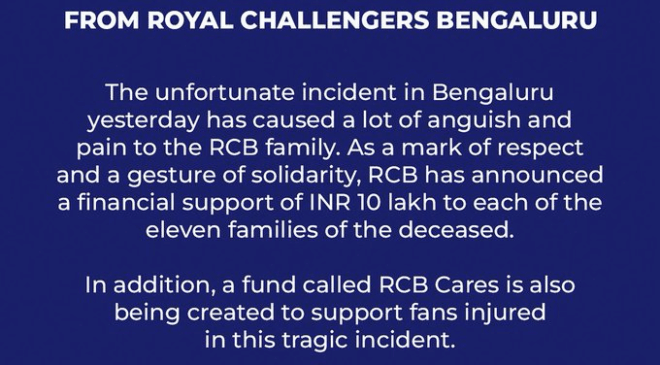 నిన్న బెంగళూరులో జరిగిన దురదృష్టకర ఘటన ఆర్సీబీ ఫ్యామిలీకి తీవ్ర వేదన కలిగించిందని రాయల్‌ చాలెంజన్స్‌ బెంగళూరు చెప్పింది. ఈ తొక్కిసలాటలో మృతి చెందిన 11 మంది కుటుంబాలకు ఒక్కొక్కరికి రూ.10 లక్షల ఆర్థిక సాయం అందిస్తామని ప్రకటించింది.
