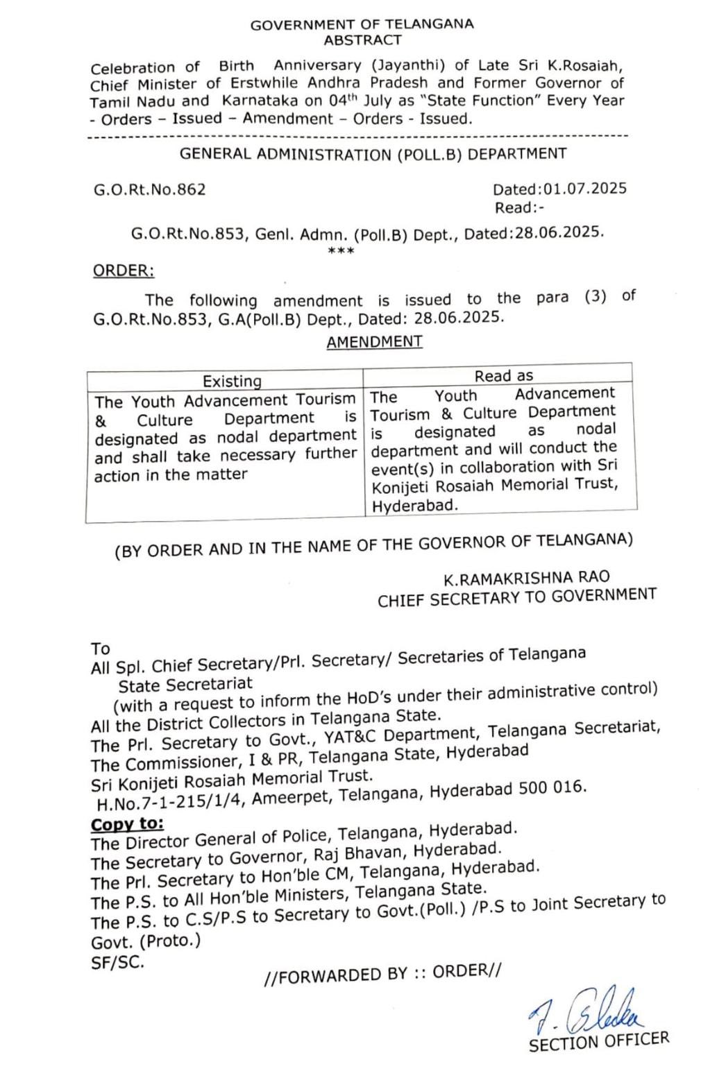 ఇక నుండి రాష్ట్రంలో ప్రతి సంవత్సరం అధికారికంగా మాజీ కాంగ్రెస్ ముఖ్యమంత్రి రోశయ్య జయంతి వేడుకలు నిర్వహించనున్నారు. జూలై 4న ఉమ్మడి ఆంధ్రప్రదేశ్ మాజీ ముఖ్యమంత్రి స్వర్గీయ కొణిజేటి రోశయ్య జయంతి నిర్వహించాలని ఉత్తర్వులు జారీ చేసింది రేవంత్ ప్రభుత్వం.