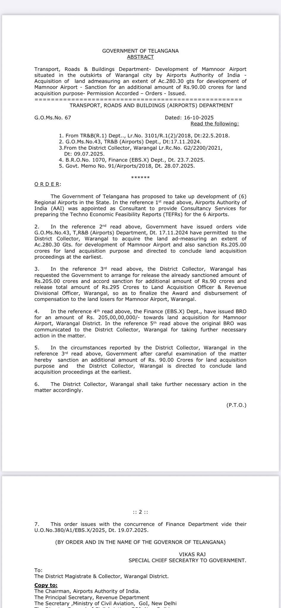 మామునూరు ఎయిర్పోర్టు భూసేకరణ కోసం నిధులు విడుదల చేసింది ప్రభుత్వం. రూ.90 కోట్లు మంజూరు చేస్తూ ప్రభుత్వం ఉత్తర్వులు జారీ చేసింది.