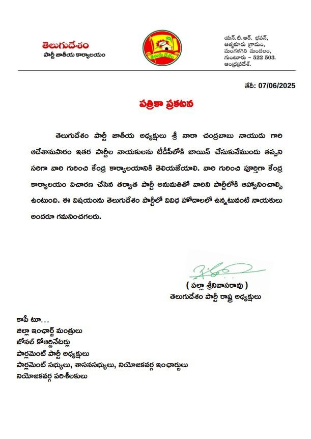ఇతర పార్టీల నేతలను టీడీపీలో చేర్చుకోవద్దని ఆదేశాలు జారీ చేశారు. ఒకవేళ ఎవరైనా టీడీపీలో చేరాలనుకుంటే వారి వివరాలను కేంద్ర కార్యాలయానికి పంపించాలని, ఎంక్వైరీ చేసి అనుమతి ఇచ్చిన తర్వాతే పార్టీలో చేర్చుకోవాలని ఉత్తర్వులు జారీ చేశారు టీడీపీ రాష్ట్ర అధ్యక్షుడు పల్లా శ్రీనివాస్.