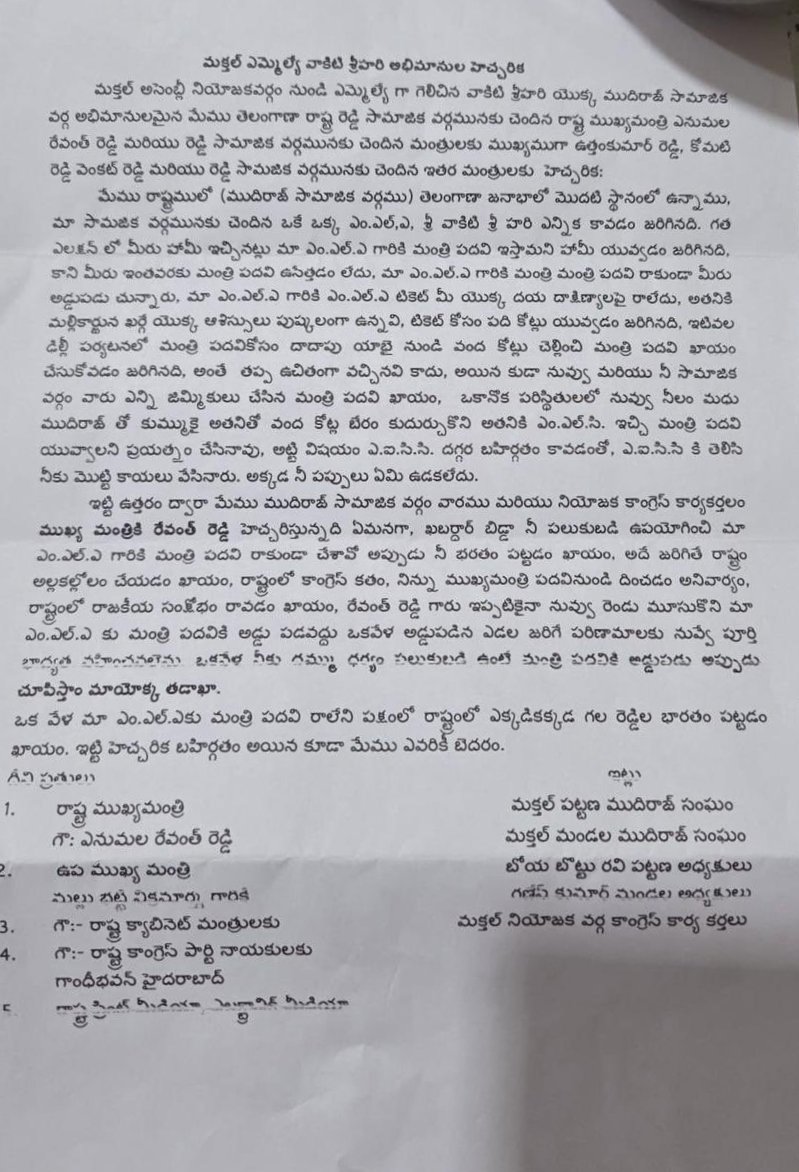 ఎమ్మెల్యే టికెట్ కోసం 10 కోట్లు ఇచ్చామని, మంత్రి పదవి కోసం 100 కోట్లు ఖర్చు పెట్టామని.. తీరా మంత్రి పదవి వచ్చే సమయానికి అడ్డుపడుతున్నారు అంటూ రేవంత్ రెడ్డి, రెడ్డి నాయకులను దూషిస్తూ లేఖ రాశారు వాకిటి శ్రీహరి అభిమానులు, ముదిరాజ్ సంఘం నాయకులు.