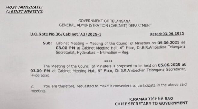 జూన్ 5న తెలంగాణ కేబినెట్ భేటీ జరగనుంది. మధ్యాహ్నం 3 గంటలకు సీఎం రేవంత్ అధ్యక్షతన మంత్రివర్గ సమావేశం జరగనుండగా రాజీవ్ యువవికాసం, వానాకాలం పంటలు, ఇందిరమ్మ ఇళ్లు, భూభారతిపై చర్చ జరగనుంది.