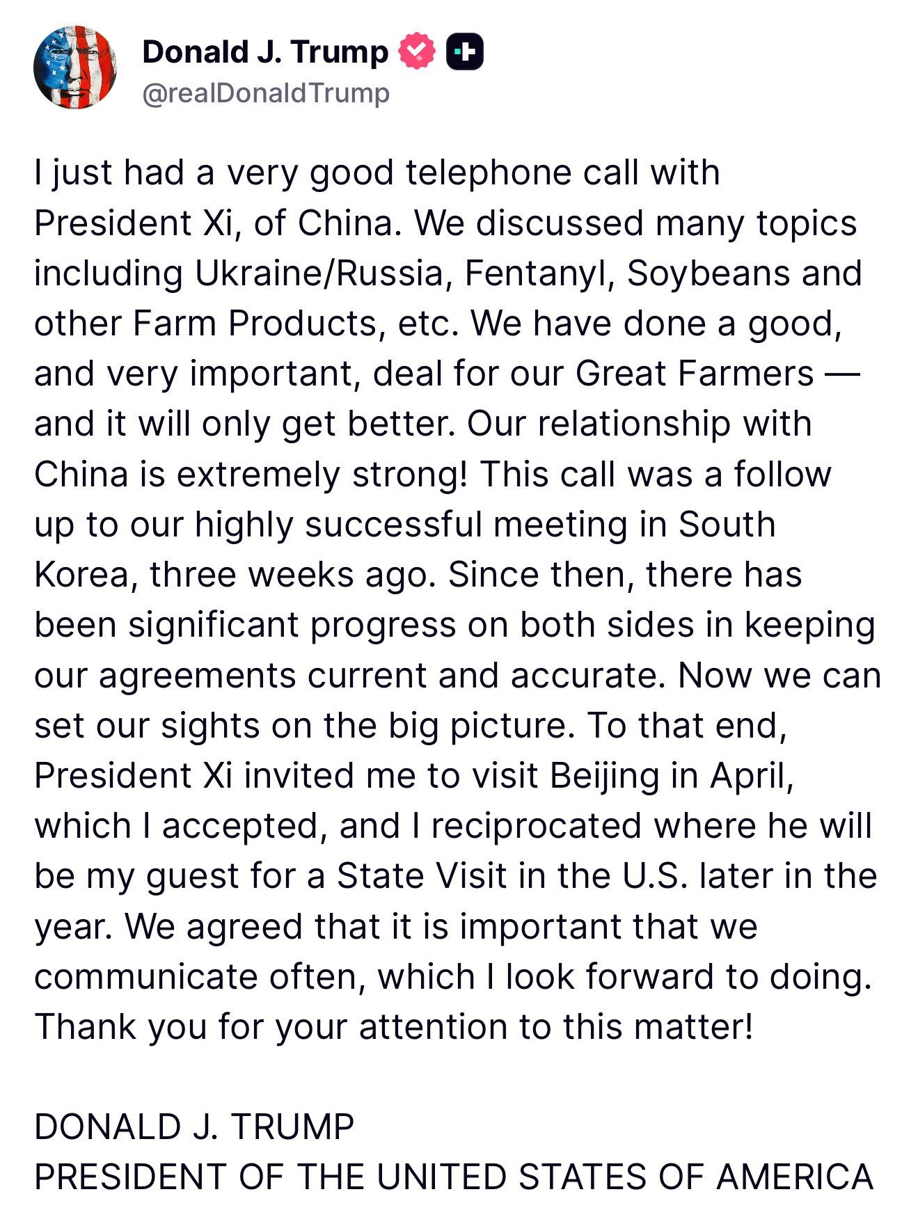 ఈ విషయాన్ని ట్రంప్ తన సోషల్ మీడియా వేదిక ‘ట్రూత్’ లో వెల్లడించారు. అంతేకాకుండా, తాను కూడా ఆ తర్వాత అమెరికాలో పర్యటించాల్సిందిగా జిన్పింగ్ను ఆహ్వానించినట్లు తెలిపారు.