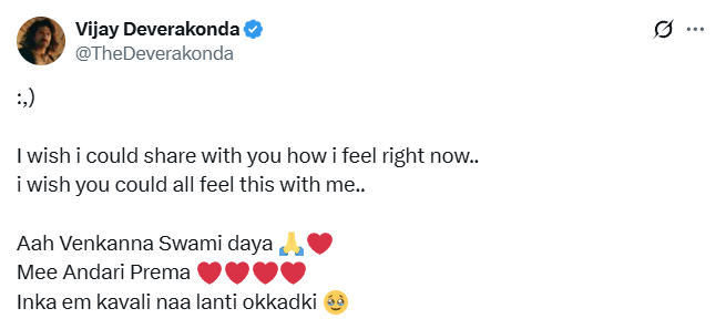 ‘ఇంతకన్నా ఏం కావాలి’… ‘కింగ్డమ్’ మూవీ రెస్పాన్స్పై విజయ్ దేవరకొండ స్పందించారు. సినిమాకి వస్తున్న పాజిటివ్ రెస్పాన్స్పై ట్వీట్ చేసిన విజయ్…అభిమానులు చూపిస్తున్న ప్రేమకు ఆనందంగా ఉందంటూ పోస్ట్ చేశారు.